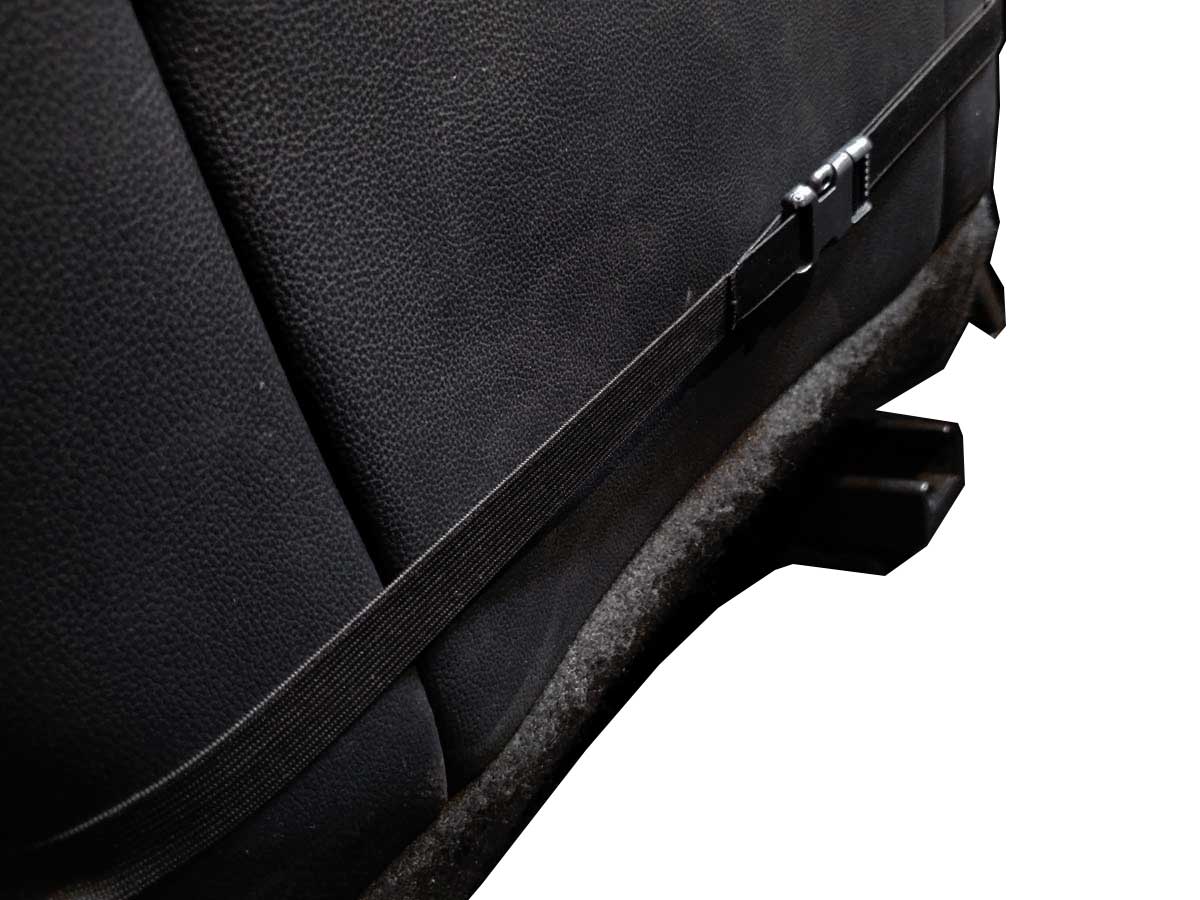 As capas para bancos frontais possuem fecho com elástico e prendedor tipo “engate rápido” que garante ajuste perfeito no banco sem a capa escorregar.