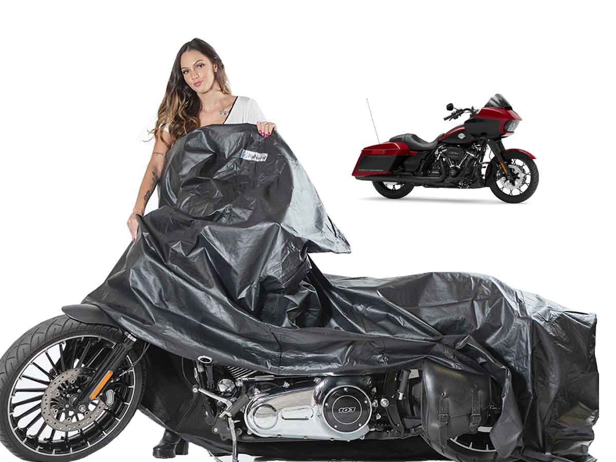 A Capa Cobrir Moto Impermeável Harley Davidson Road Glide é resistente ao Sol, Chuva, Poeira e animais domésticos de pequeno porte, podendo ser utilizada em ambientes internos ou externos.