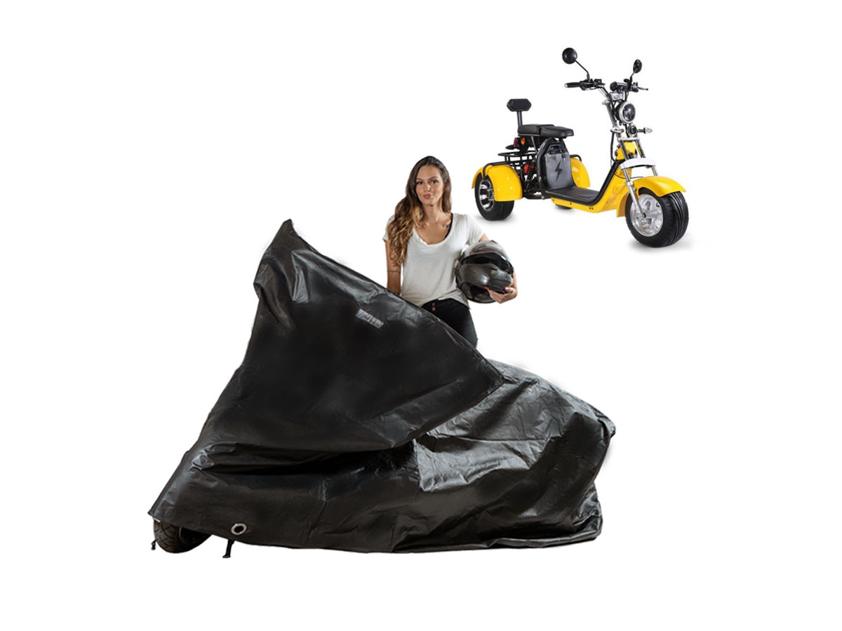 A Capa Cobrir Triciclo Elétrico Impermeável com forro é resistente ao Sol, Chuva, Poeira e animais domésticos de pequeno porte, podendo ser utilizada em ambientes internos ou externos.