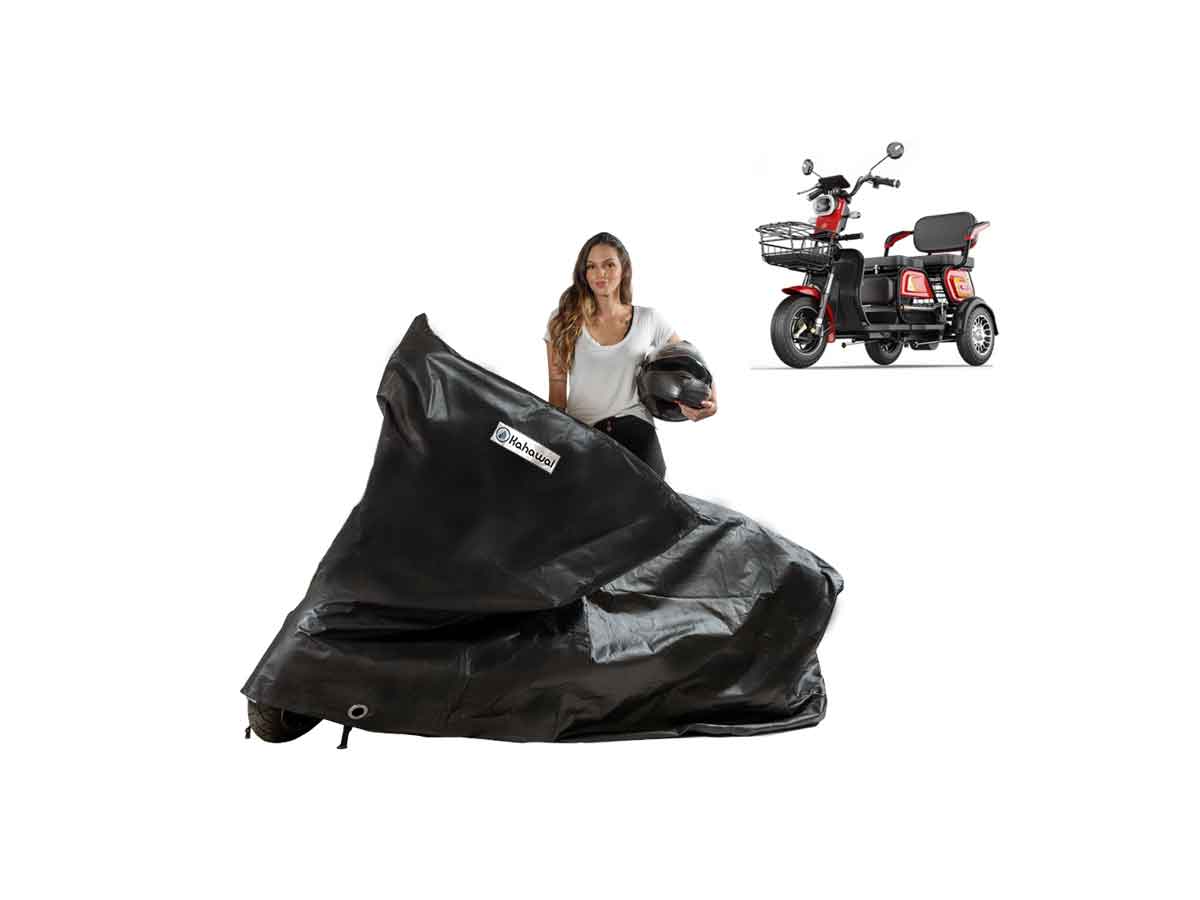 A Capa Cobrir Triciclo Elétrico Joy Impermeável com forro é resistente ao Sol, Chuva, Poeira e animais domésticos de pequeno porte, podendo ser utilizada em ambientes internos ou externos.