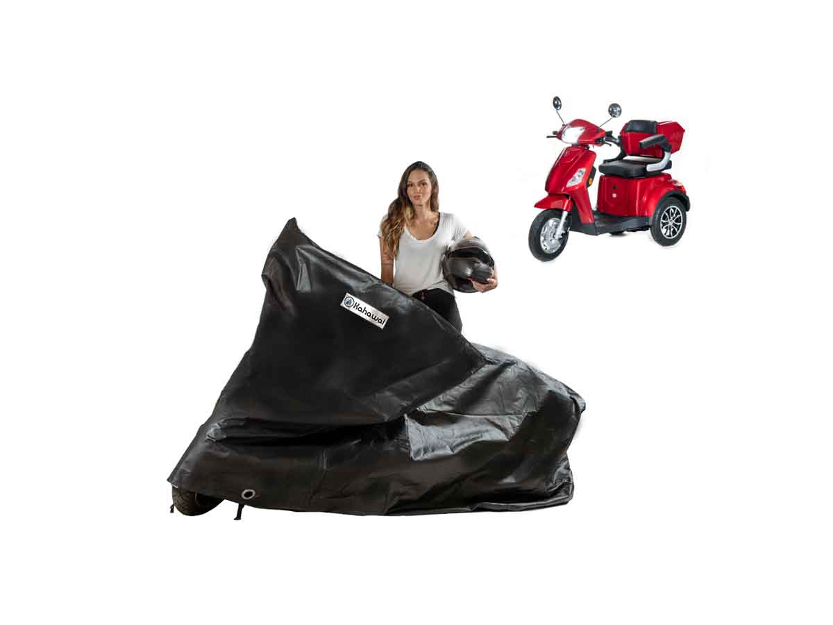 A Capa Cobrir Triciclo Elétrico Plus Impermeável com forro é resistente ao Sol, Chuva, Poeira e animais domésticos de pequeno porte, podendo ser utilizada em ambientes internos ou externos.