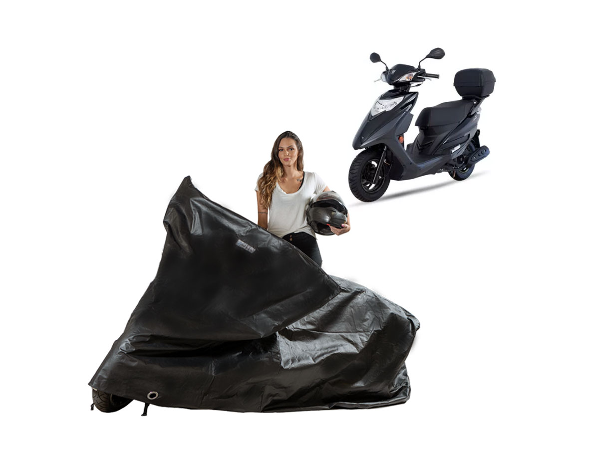 A Capa Protetora Impermeável Forrada Haojue Lindy 125 com Baú é resistente ao Sol, Chuva, Poeira e animais domésticos de pequeno porte, podendo ser utilizada em ambientes internos ou externos.