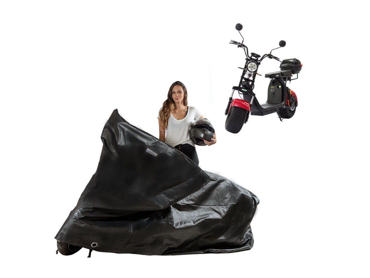 A Capa Protetora Impermeável Moto Scooter Elétrica com baú é resistente ao Sol, Chuva, Poeira e animais domésticos de pequeno porte, podendo ser utilizada em ambientes internos ou externos.
